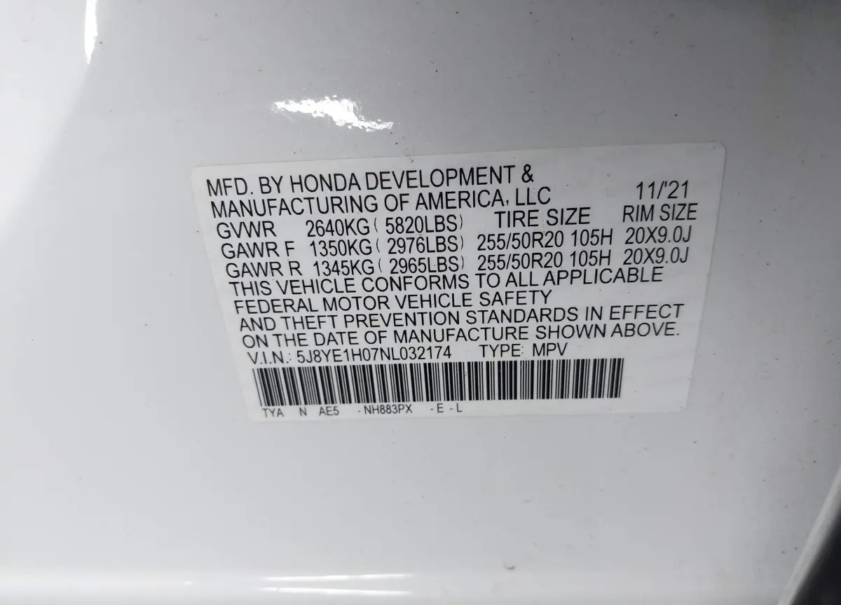 • Vin: 5J8YE1H07NL032174